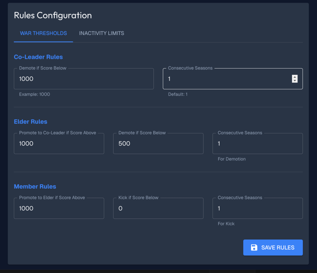 Define promotion/demotion criteria based on war performance, donations and inactivity thresholds and let ClanWizard suggest the moves.