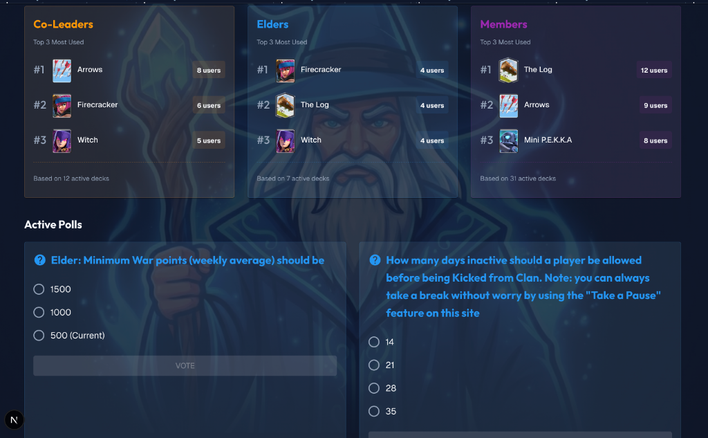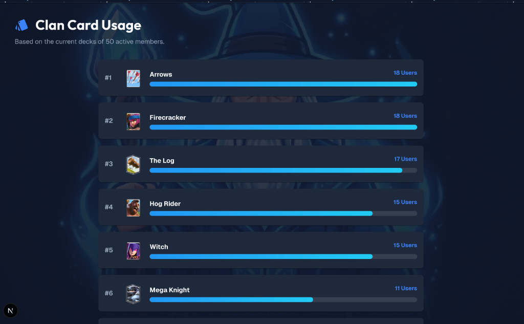Analyze your clan's deck usage. See which cards are dominating the arena and build strategies that maximize your war day wins.