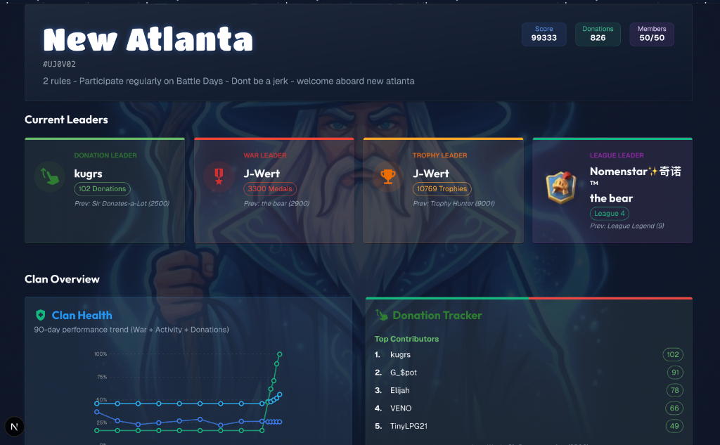 Visualize participation trends, donations, and war performance with beautiful, real-time analytics. Spot the trend before it becomes a problem.